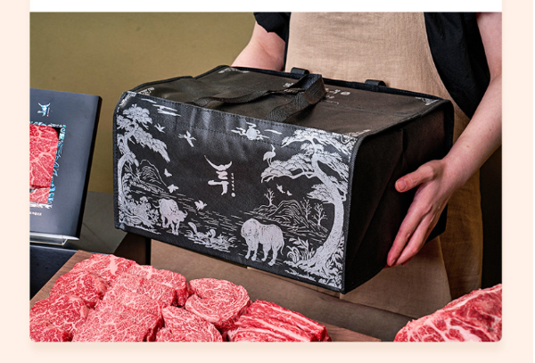 엄마네한우는 기본 구성부터 부직포 선물 가방 무료 업그레이드가 제공됩니다.