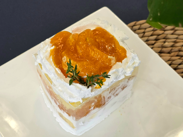 위에 다시 생크림으로 장식하고 졸인 귤이나 탕후루로 만든 과일을 얹어서 장식합니다.