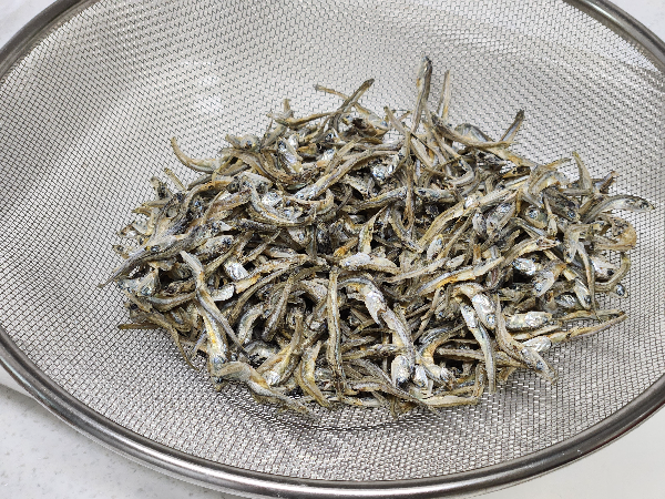멸치는 마른 팬에 중불로 볶아 수분을 날리고 비린내를 제거한 뒤 체에 걸러 부스러기와 잔가루를 털어냅니다.
