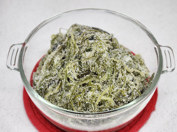 갓 채취한 생미역을 소금에 절여 만든 보존식으로 수분을 뺀 대신 고농도의 소금으로 염도를 높여 장기 보관이 가능하도록 가공한 제품입니다.