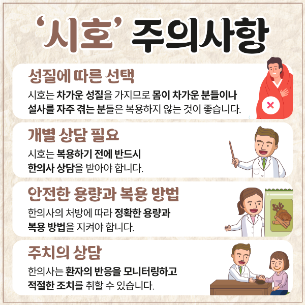 시호는 일정량 복용해도 심각한 부작용이 없다고 알려져 있지만 반드시 한의사의 진단과 용량설계를 따라야 하며 임의로 늘리거나 줄여서는 안 됩니다.