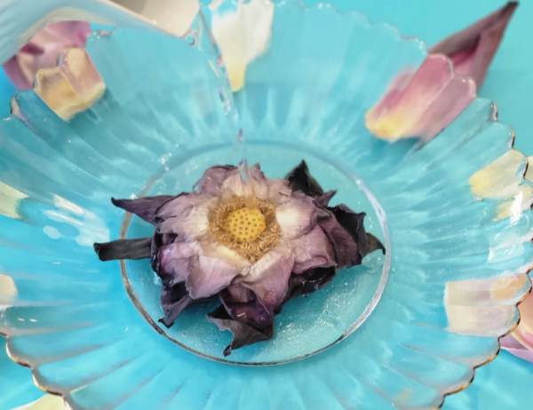 뜨거운 물에 연꽃 낭차를 넣으면 꽃잎이 서서히 벌어지면서