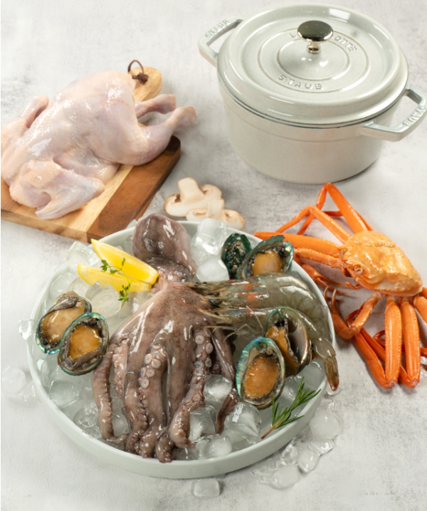 홍게·문어·전복·새우 등 해산물 구성에 통닭 한 마리 그리고 대추·황기 같은 한방 백숙 재료까지 다 준비되어 있습니다.