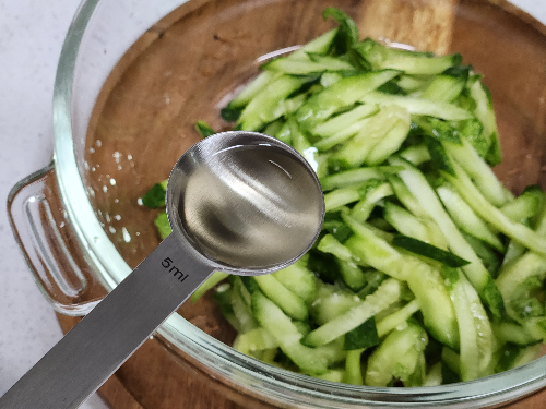 채 썬 오이에 소금을 살짝 뿌려 약 10분 절인 뒤