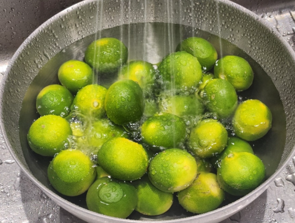 흐르는 물에 먼저 헹구고 과일용 베이킹소다를 뿌려 표면을 하나씩 닦아줍니다.